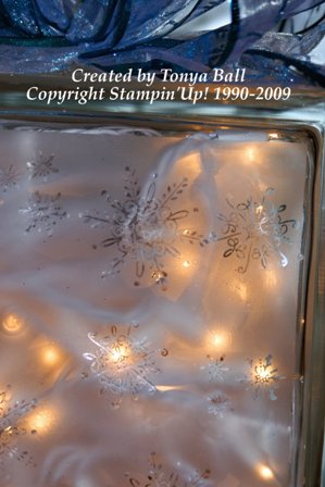 I have added a few extra pictures today because it is difficult to see the snowflakes. The top picture is a closeup and then the bottom is with the Christmas lights turned off. I hope you enjoyed today's post and if you are interested in making or buying one of these glass blocks please contact me. I do take orders for individuals who would like a personalized block. Thanks for stopping by and I hope you all have a wonderful Thanksgiving filled with great food but most of all with family and friends. Tonya