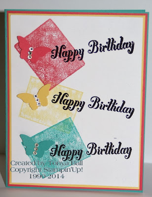 Hello and welcome to our Color Challenge Monday. I love this color combo but I must admit it would not have been one I would have put together myself. The colors are listed above and we would love to have you play along with us at SSINKspiration. It is easy to add a card and be part of the fun. I used the Bring on the Cake Stamp Set and used Black Embossing Powder to really make the Happy Birthday pop. All of the Watercolor papers in the Occasions Catalog got me to thinking about using the Clear Blocks so I inked them up and stamped them on the Whisper White paper before I embossed. Then to add just a bit more pop I added a butterfly in each color with Basic Rhinestones for their bodies. Simple yet pretty and easy to make an assortment in different colors if you need a lot of cards. Thanks for stopping by and I hope you have a great day! Tonya